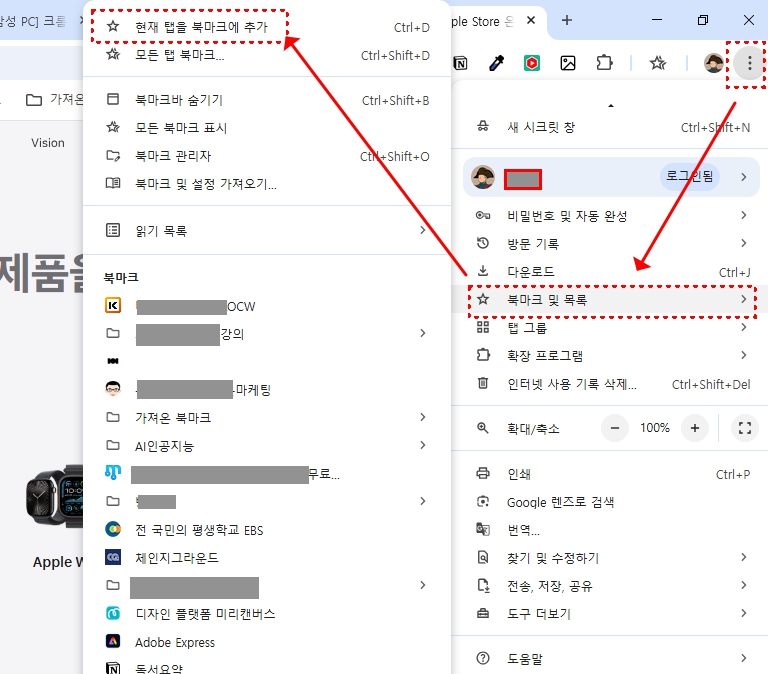[현재 탭을 북마크에 추가]를 클릭합니다.