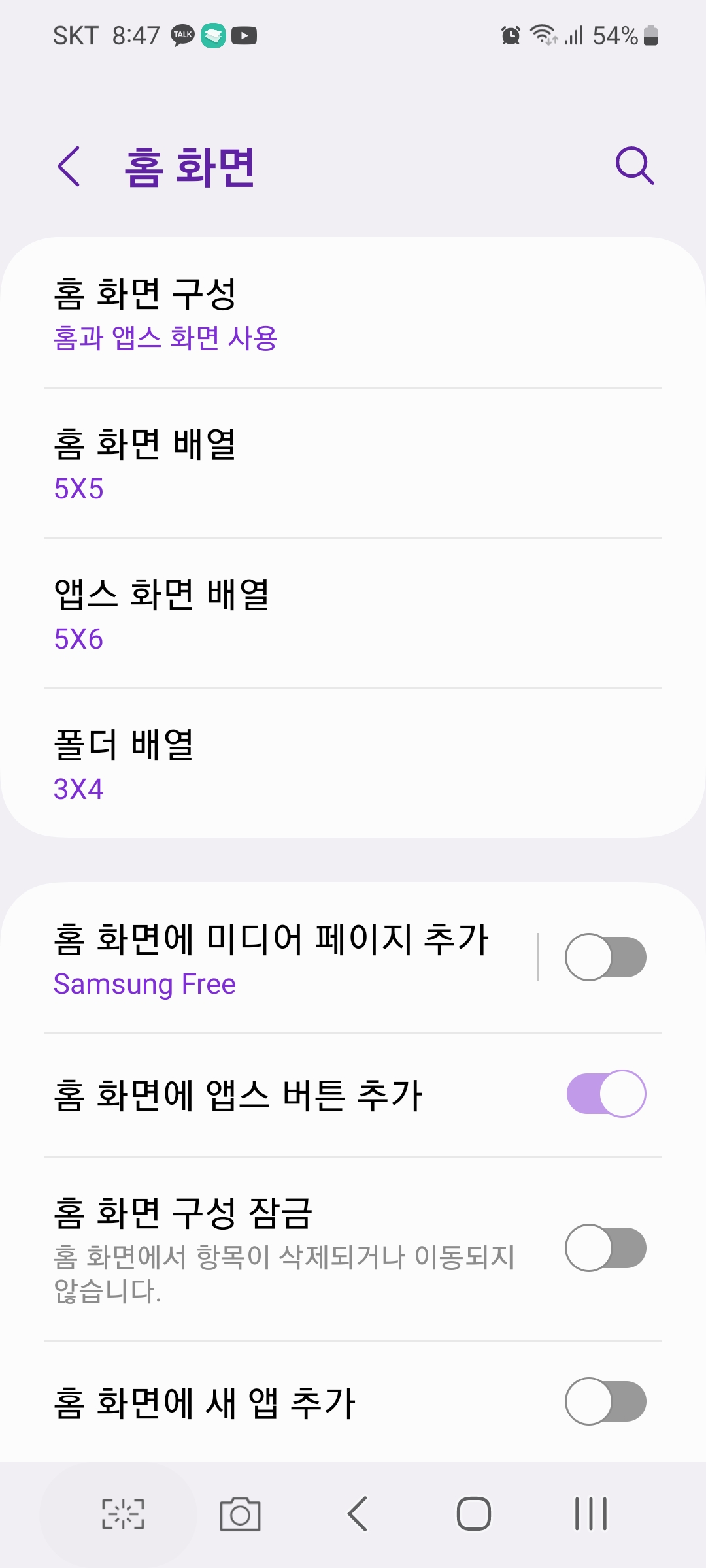 1. 홈 화면 구성을 터치하여 홈과 앱스 화면 사용을 활성화합니다.