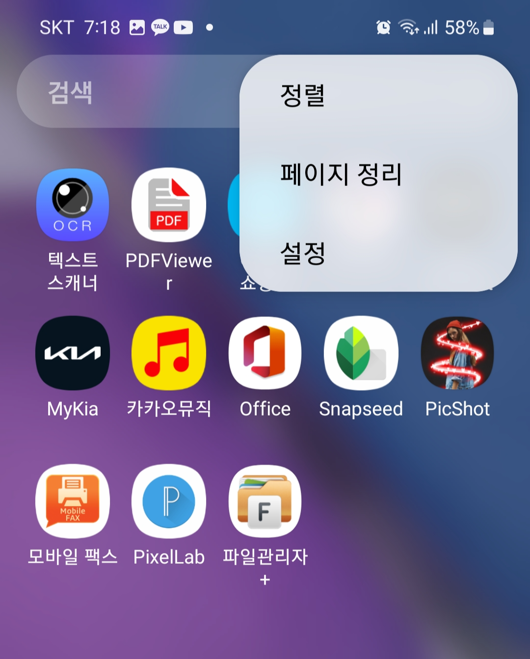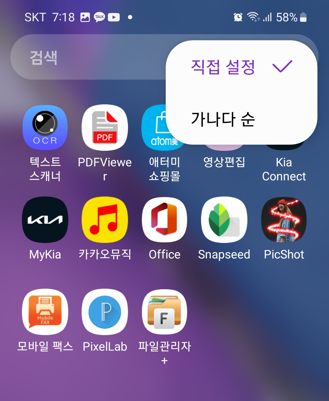 앱을 설치하는대로 그냥 두면 나중에 찾기가 쉽지 않습니다. 그래서 사용하기 편리하도록 정렬하는 것이 좋습니다. 앱스 화면 상단 검색창 오른쪽에 더 보기 점 3개가 보입니다. 이것을 누르면 앱을 정렬하는 팝업창이 표시됩니다. 여기서 정렬을 누르면 직접설정, 가나다 순이 표시됩니다. 가나다 순을 선택하면 앱이 가나다 순으로 정렬되어 찾기가 수월합니다. 더 빠른 방법은 검색창에 해당 앱을 입력하여 검색합니다. 앱도 많이 저장되면 앱스 화면이 여러 페이지로 표시됩니다.