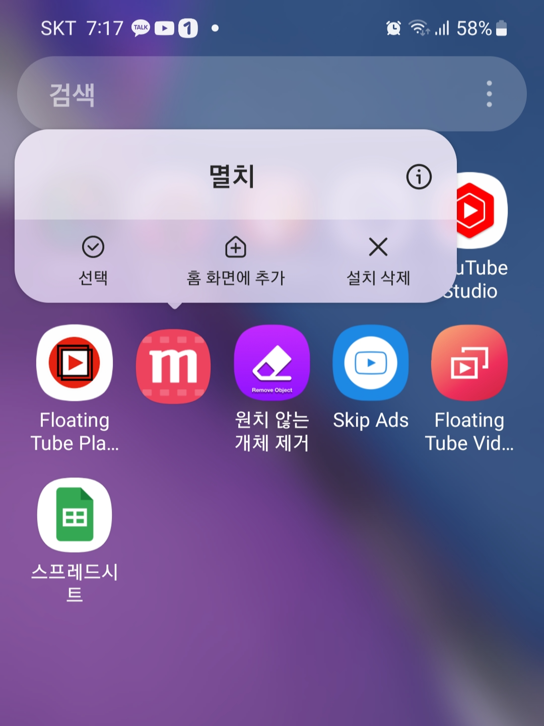 설치된 앱을 삭제하는 것은 간단합니다. 먼저 삭제할 앱을 손가락으로 꾹 누르면 팝업창이 뜹니다. 팝업창에서 설치 삭제를 클릭하면 간단히 삭제됩니다. 해당 앱은 스마트폰에서 삭제된 것입니다.