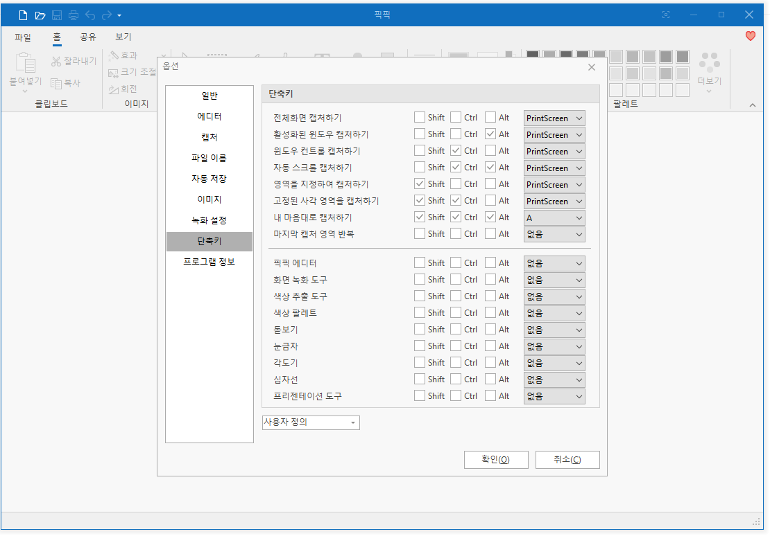 옵션 창을 열어 단축키를 적절하게 설정하여 사용합니다. 옵션창의 단축키는 아래 사진을 참고하시기 바랍니다.